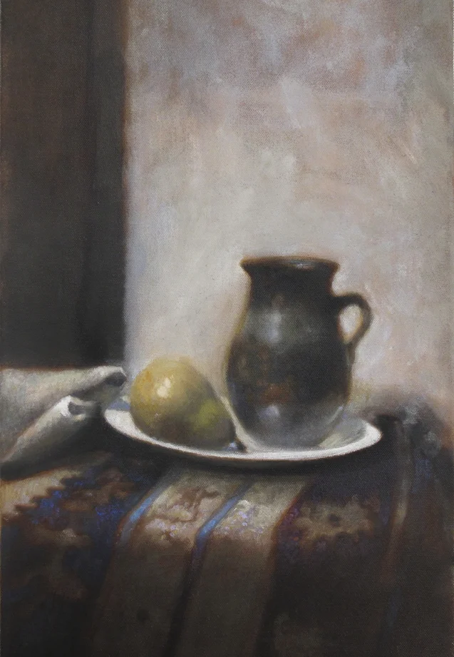 I plan to do more work with the camera obscura and continue the investigation into its influence on my vision. If Vermeer worked with this process he would have seen the advantage of the correct perspective given by the camera, the accurate diminution of forms as they recede, the greying of color, the precision of complex forms in space. But none of this takes away from his genius to combine these elements into unforgettable works of art. His patience and vision are clearer to me as I paint inside the darkened box.